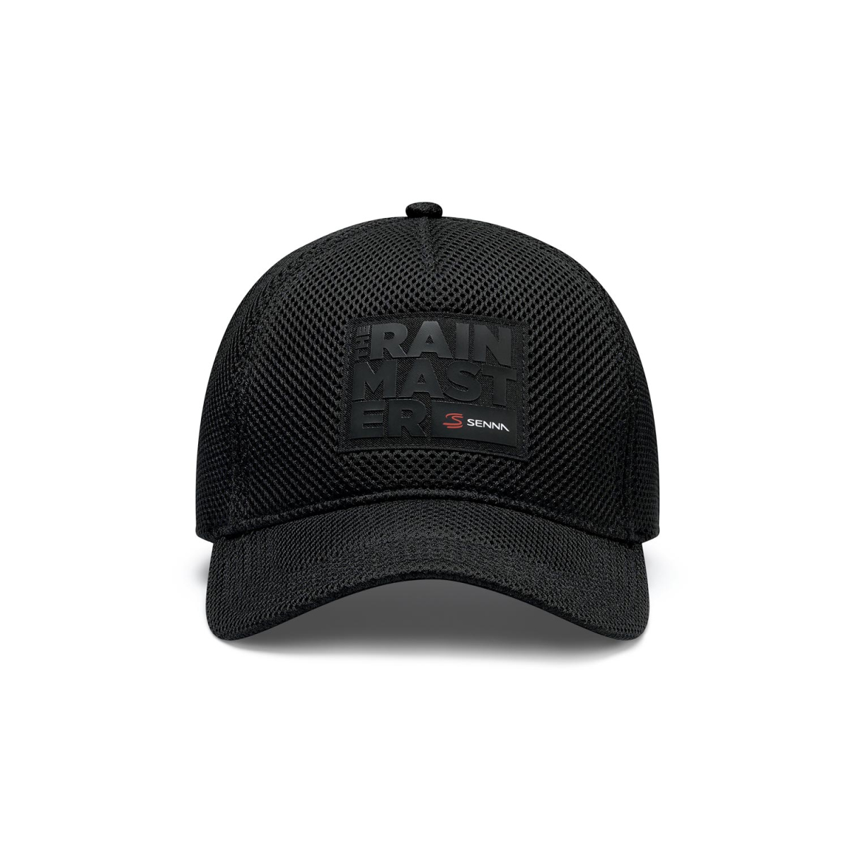 Na obrazku jest czarna czapka z daszkiem z napisem "THE RAIN MASTER" i mniejszym napisem "SENNA". Czapka ma sportowy wygląd, jest wykonana z oddychającego materiału i jest ustawiona tak, że widoczna jest przednia część z napisami. Napis "THE RAIN MASTER" znajduje się nad mniejszym napisem "SENNA", który odnosi się do legendarnego brazylijskiego kierowcy Ayrtona Senny, znanego ze swoich doskonałych umiejętności jazdy w deszczu.