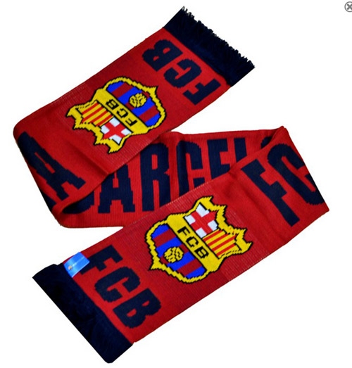Szalik katalońskiego klubu piłkarskiego FC Barcelona. Granatowe napisy na czerwonym tle uzupełnia dumne logo klubu.