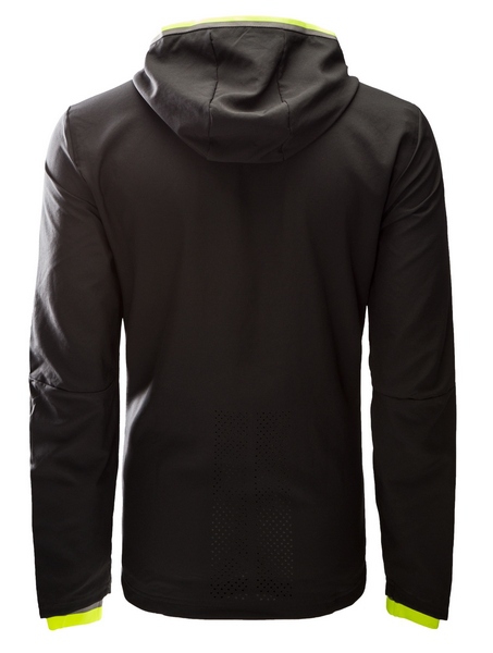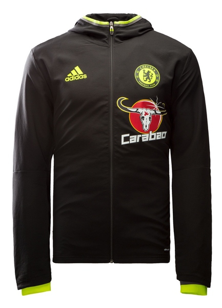 Czarna kurtka męska z kolekcji Adidas 2016. Kurtka wyposażona w podszewkę, kaptur ozdobiony w szary i żółty pasek. Kurtka i kieszenie zapinane są na zamek. Na lewej piersi widnieje logo Chelsea FC a na prawej logo Adidas w kolorze żółtym.