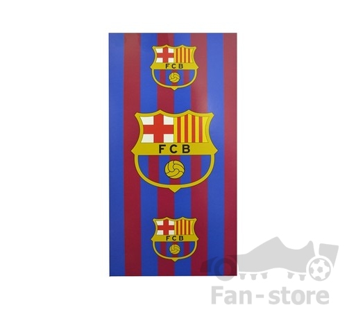 Ręcznik ma 3 znaki klubu FC Barcelona, tło w paski.