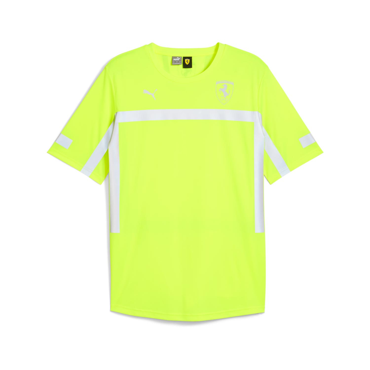 Koszulka ma nowoczesny neonowo-żółty kolor, który jest uzupełniony elementami odblaskowymi dla lepszej widoczności i bezpieczeństwa o zmierzchu i w nocy. Na przedniej stronie koszulki znajduje się stylizowane logo Ferrari i logo Puma, które nadają koszulce ekskluzywny wygląd. Odblaskowe paski na rękawach i bokach koszulki zapewniają, że będziesz widoczny w każdych warunkach.