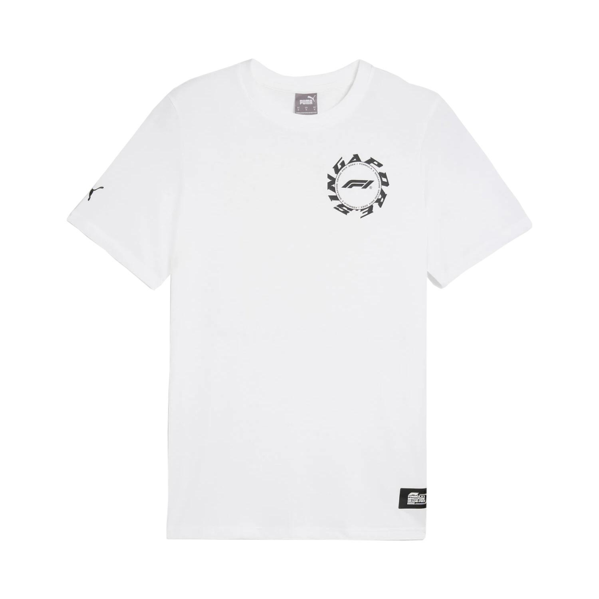 Wzbogać swoją garderobę o białą koszulkę marki Puma, idealną dla wszystkich fanów Formuły 1. Ta stylowa koszulka ma krótkie rękawy i na lewej stronie klatki piersiowej wyróżnia się wyraźnym czarnym nadrukiem z tekstem Singapore oraz ikonicznym logo Formuły 1. Na lewym rękawie znajdziesz małe, ale eleganckie logo Puma, które podkreśla jakość i styl tej marki.