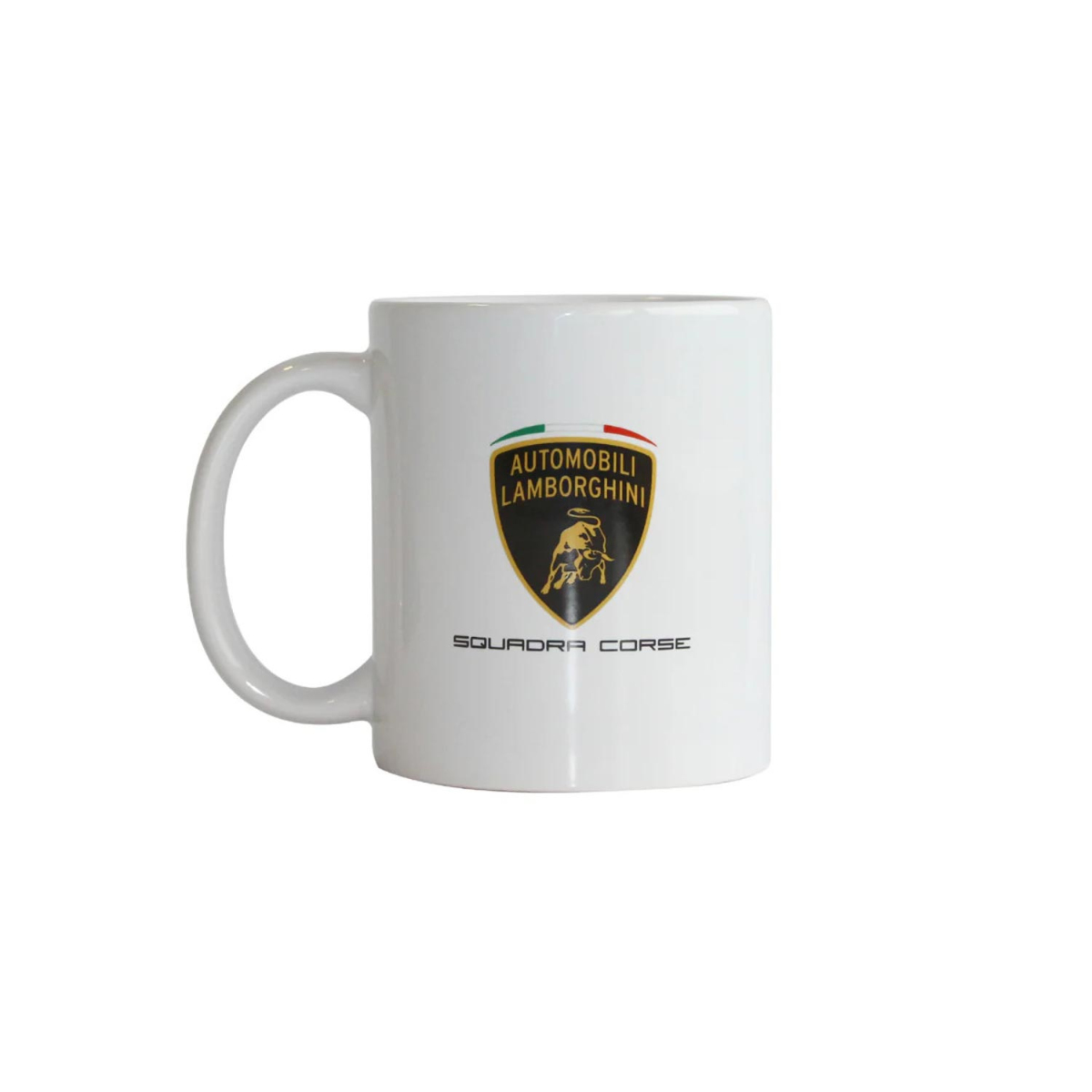 Kubek jest wykonany z wysokiej jakości ceramiki, która zapewnia jego długą żywotność i odporność na codzienne użytkowanie. Logo Lamborghini na przedniej stronie kubka jest wykonane w eleganckim złotym odcieniu, który dodaje całemu designowi luksusowego charakteru. Napis "Squadra Corse" jest napisany nowoczesną, dynamiczną czcionką, która odzwierciedla sportowego ducha i wyścigową tradycję tej prestiżowej marki samochodowej. Na przeciwnej stronie kubka, gdzie znajdują się dwie zielone pionowe linie, design jest inspirowany włoską trójkolorową flagą, co jest odniesieniem do włoskiego pochodzenia marki Lamborghini.