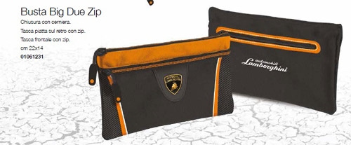 Praktyczny dwukomorowy piórnik na długopisy. Wykonany w czarno-pomarańczowej kombinacji kolorów, ozdoniony logo i napisem Lamborghini. Zapinany na zamek błyskawiczny. Sprawi radość niejednemu koneserowi szybkich samochodów. Piórnik z oficjalnej serii akcesoriów z katalogu produktów klubowych. Towary są sprzedawane za zgodą właścicieli praw licencyjnych. Produkt posiada oficjalną licencję