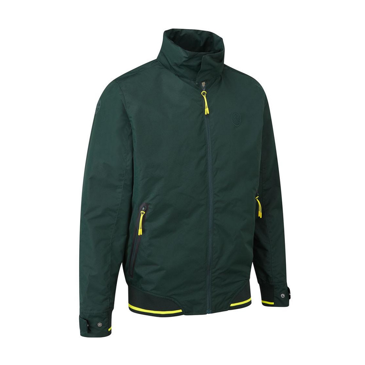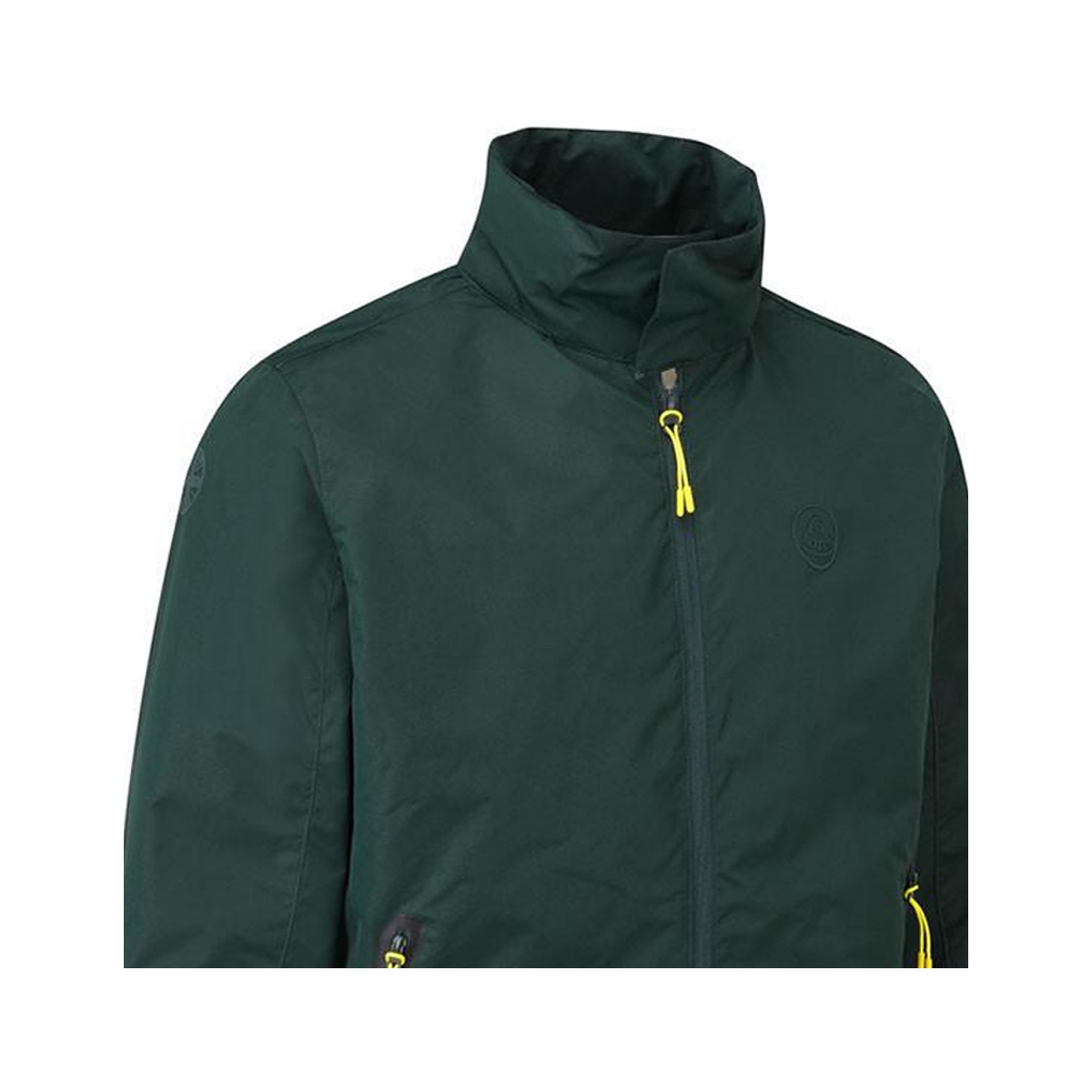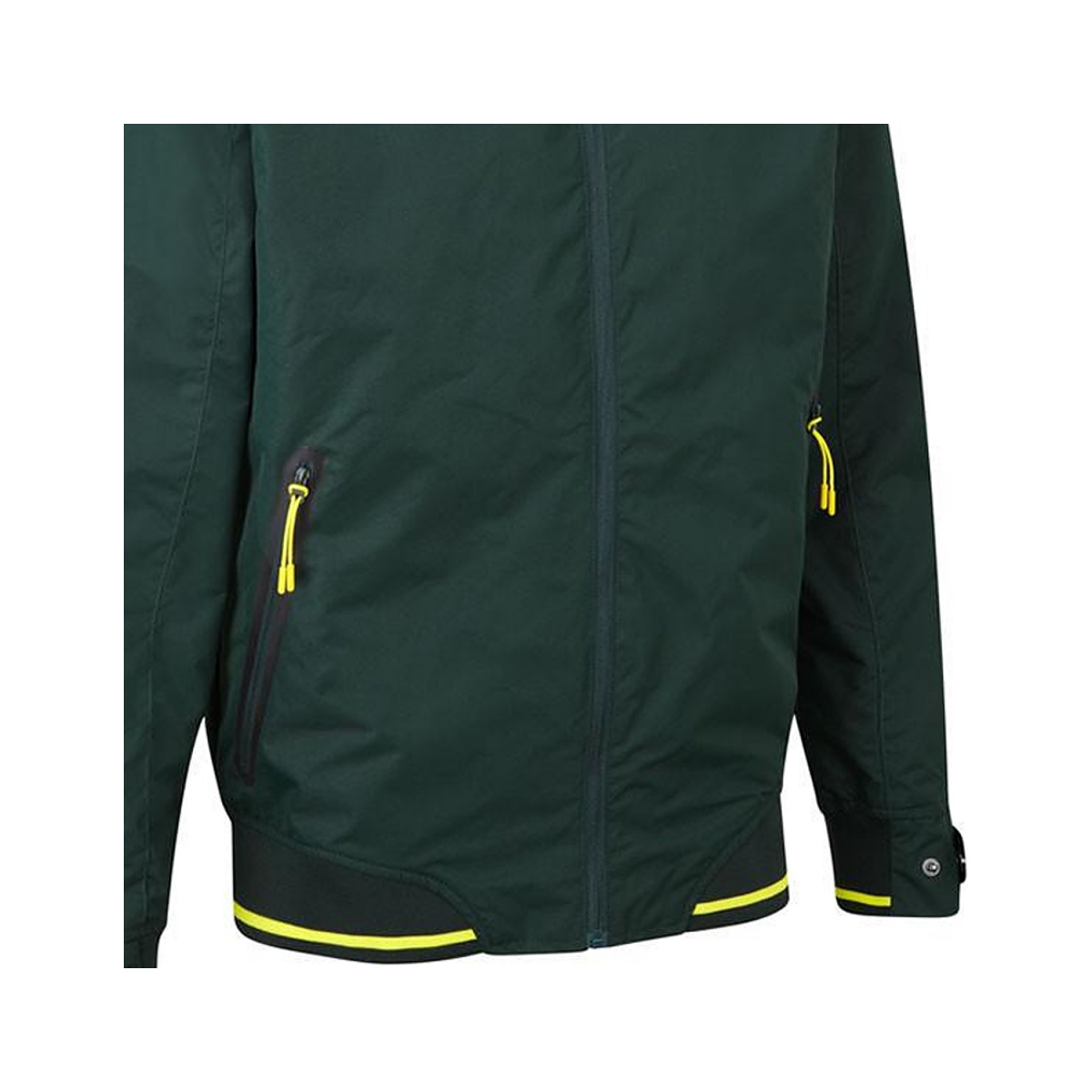 Dwie boczne kieszenie kurtki wykończone czarną obwódką zapinane są na suwaki z charakterystycznym żółtym podświetleniem.