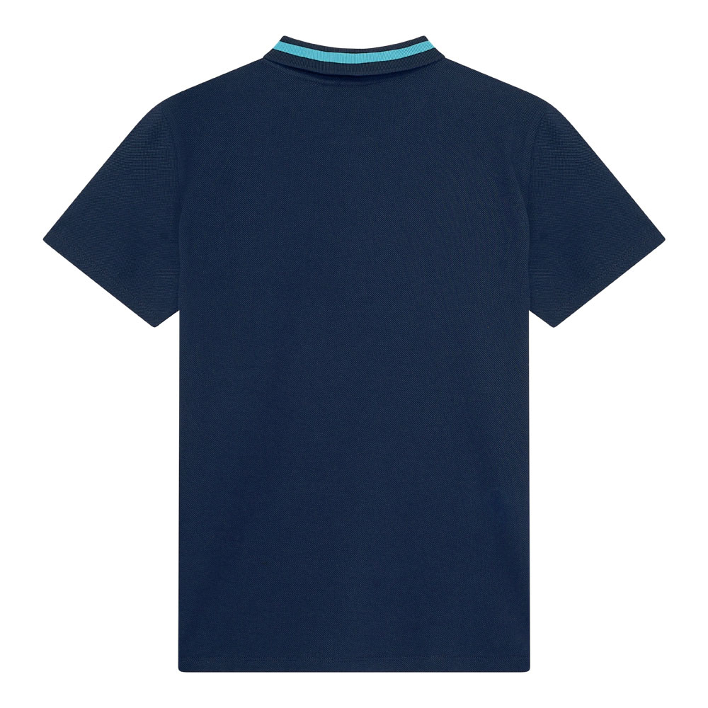 Na kołnierzyku i rękawach znajdują się jasnoniebieskie paski, które nadają koszulce stylowy i sportowy wygląd.