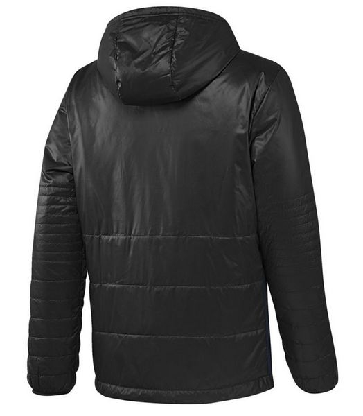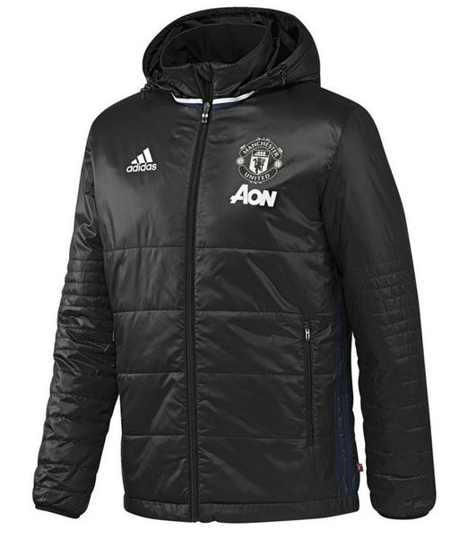 Czarna męska kurtka z kolekcji adidas 2016. Na lewej piersi widnieje logo zespołu Manchesteru United a na prawej logo Adidas, oba w kolorze białym. Kurtka posiada głęboki kaptur, dwie kieszenie z przodu kurtki.
