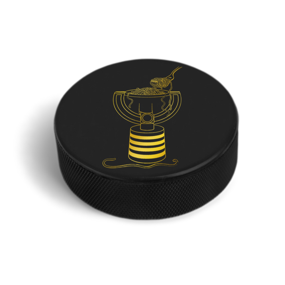 Ilustracja kubka z makaronem i widelcem jest szczegółowo dopracowana, co nadaje krążkowi wyjątkowy i zabawny wygląd. Ten design może być częścią limitowanej edycji krążków, które są przeznaczone dla fanów hokeja, którzy lubią nietypowe i kolekcjonerskie przedmioty.