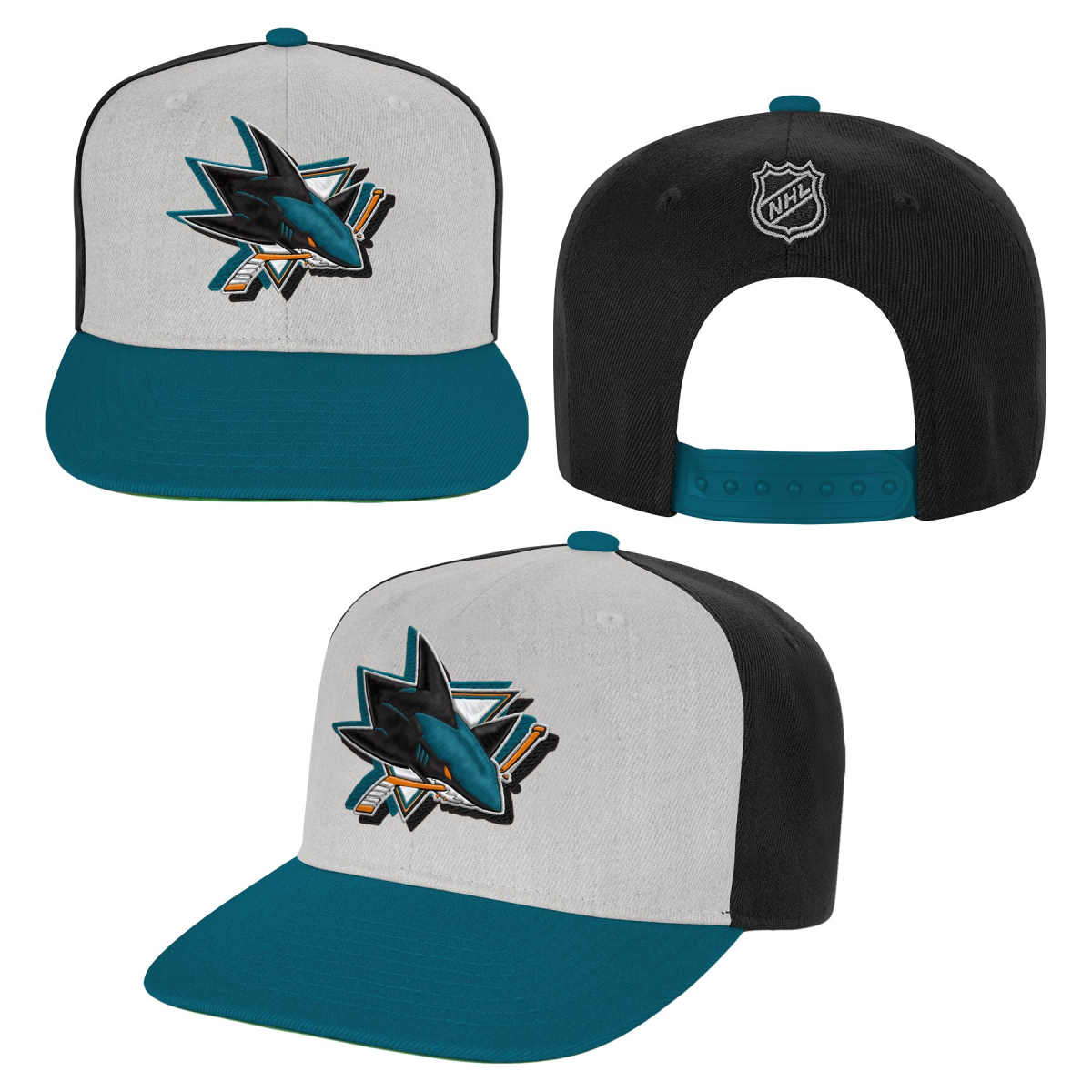Na obrazku jest czapka z daszkiem z logo drużyny hokejowej San Jose Sharks. Czapka jest w kolorach czarno-biało-turkusowym z logo rekina na przedniej stronie. Logo jest wyraziste i szczegółowo wykonane, przedstawiające rekina w akcji z ostrymi zębami i kijem hokejowym w pysku, co symbolizuje waleczność i dynamikę drużyny.