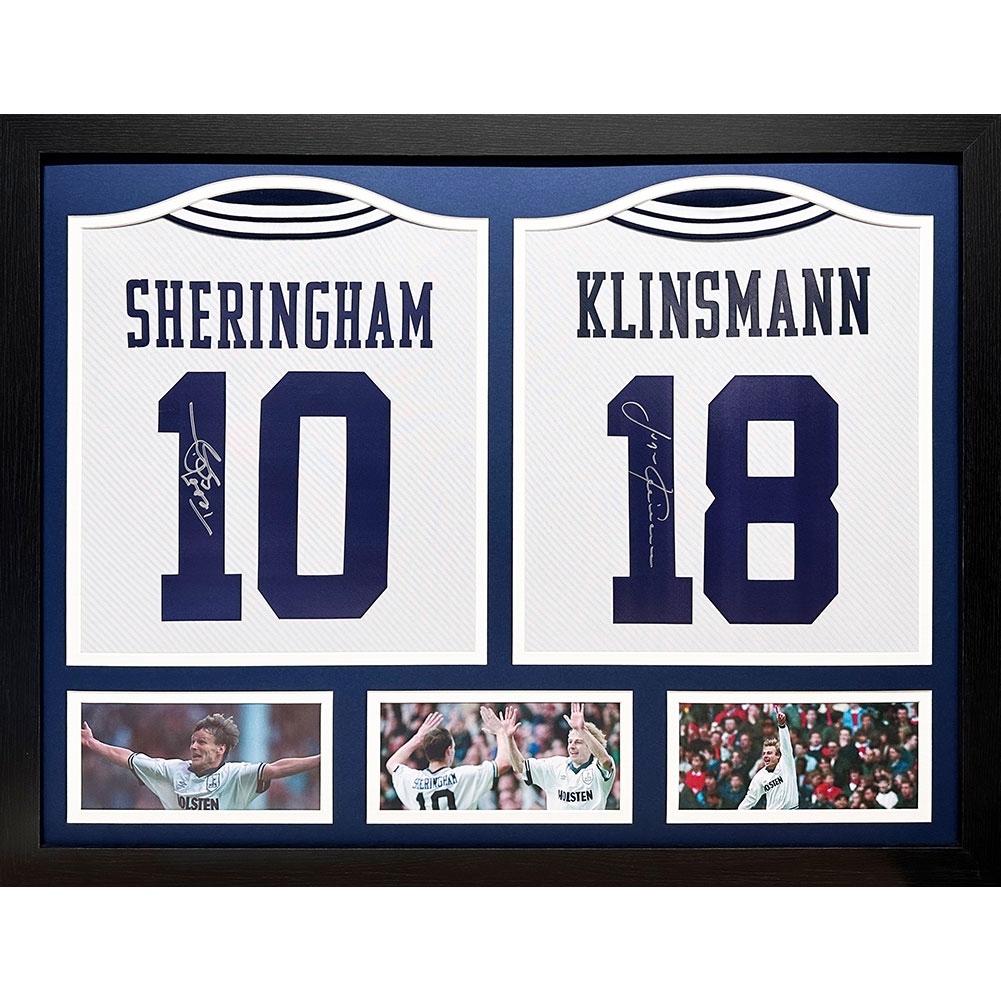 Słynni piłkarze koszulki w ramkach Tottenham Hotspur FC 1994 Klinsmann & Sheringham Signed Shirts (Dual Framed)